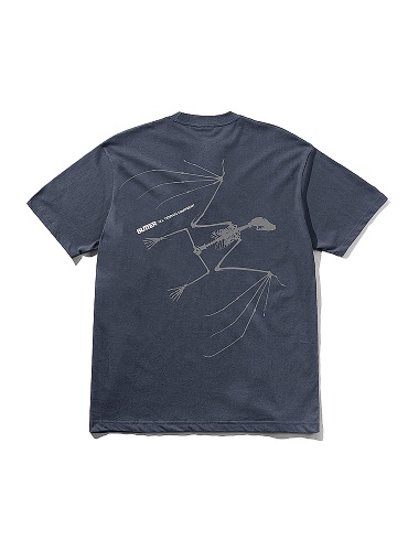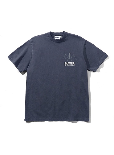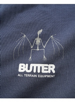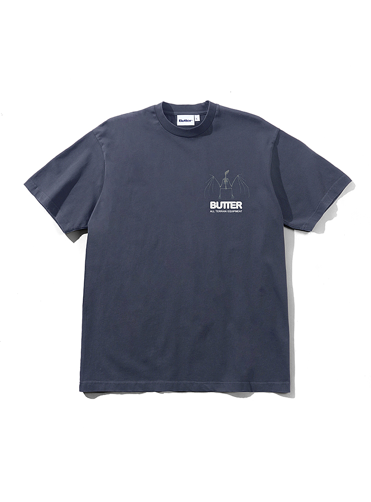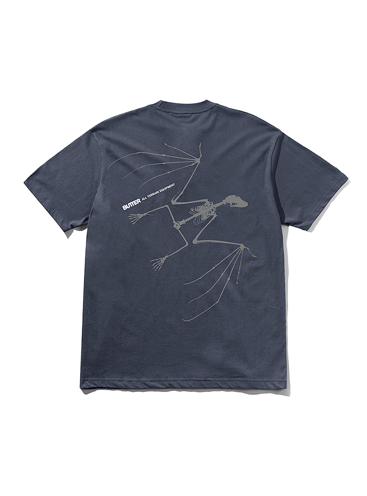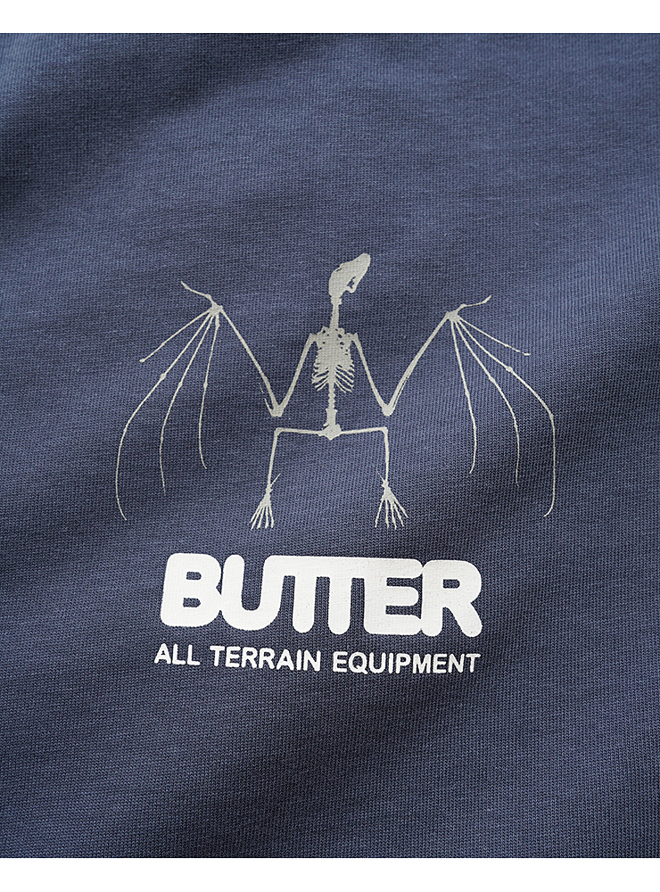 Stålblå Butter t-shirt med tryck fram och bak. Butter all terrain equipment. Fladdermusskelett kanske?
