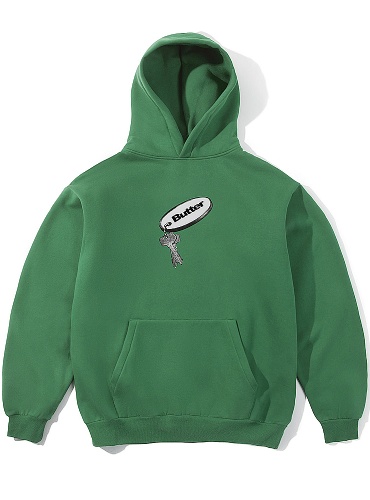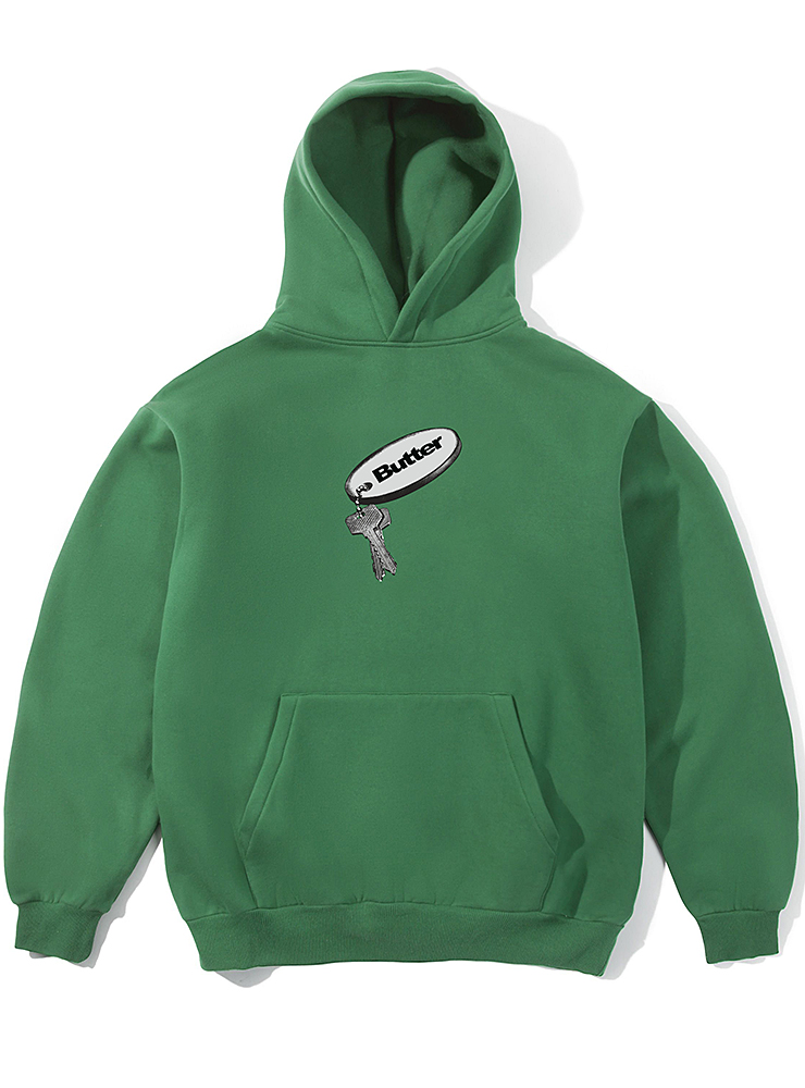 Grön Butter hood med tryck med en nyckelring det står BUTTER på.
