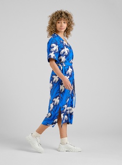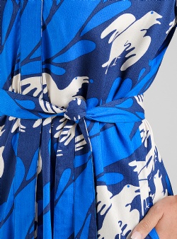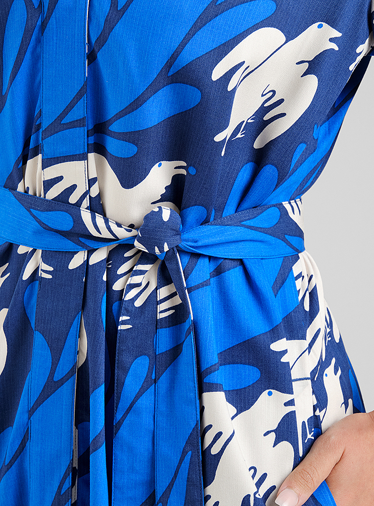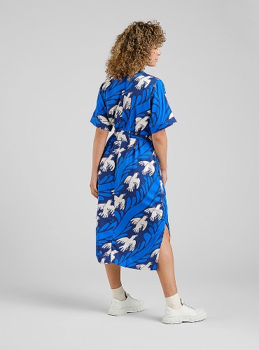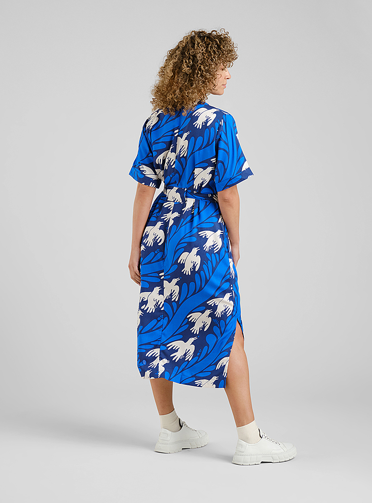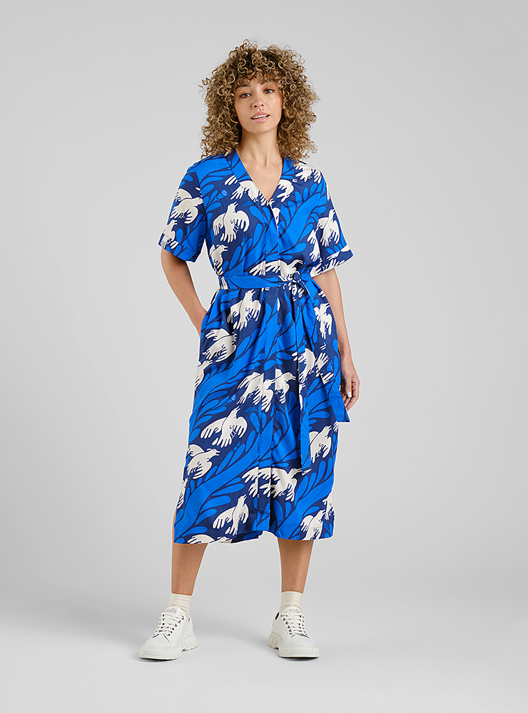 Fågelmönstrad Dedicated klänning designad av konstnären Carl Johan DeGeer. Klänning i viskos, med knappar och skärp i midjan.