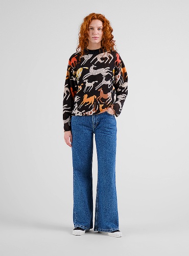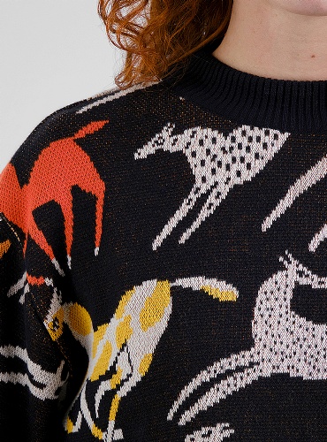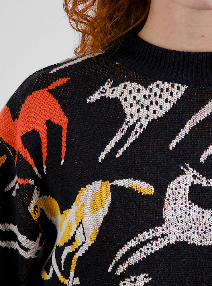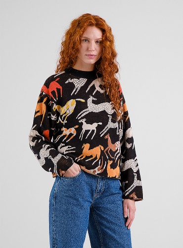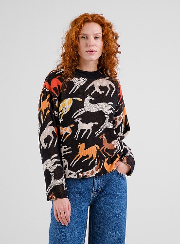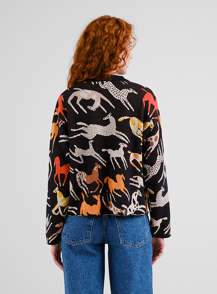 Stickad Dedicated tröja med tryck designat av den ungerska konstnären och grafikern Eniko Katalin Eged. Hon gör en fantastisk kollektion tillsammans med Dedicated och vi har många av plaggen. Såklart att du ska ha en stickad tröja med en massa hästar på!