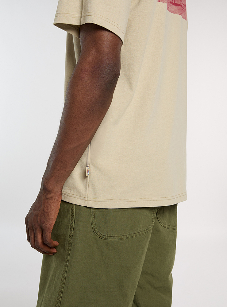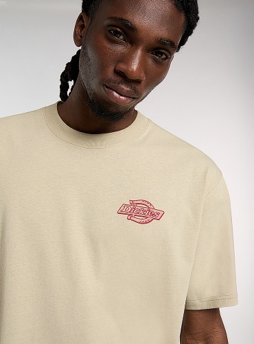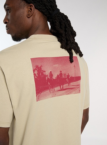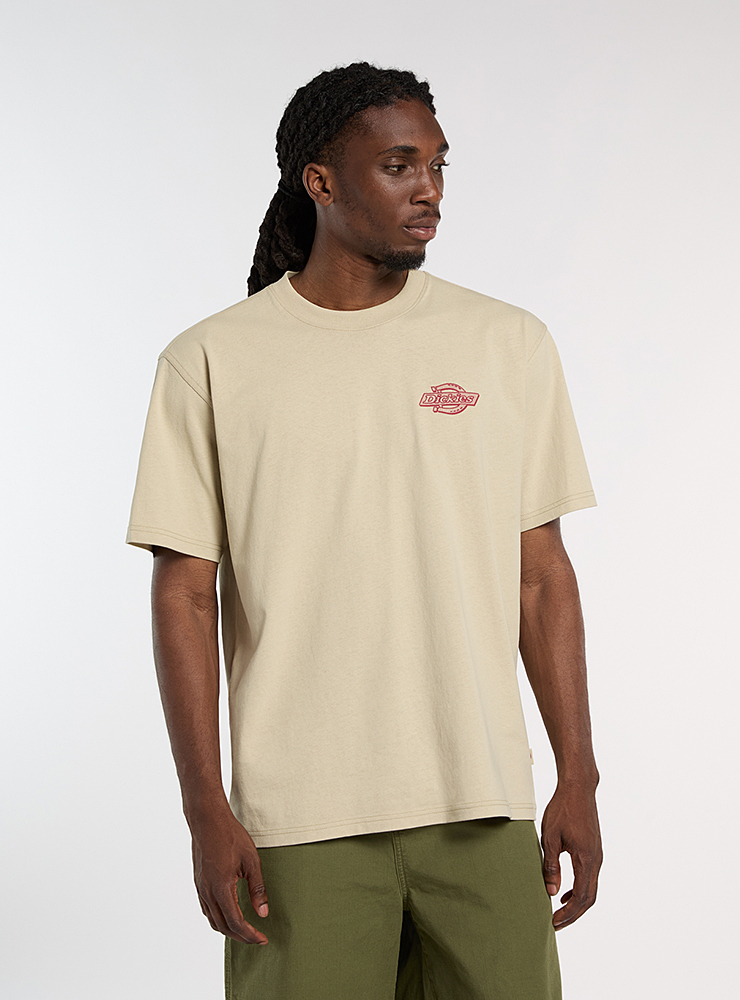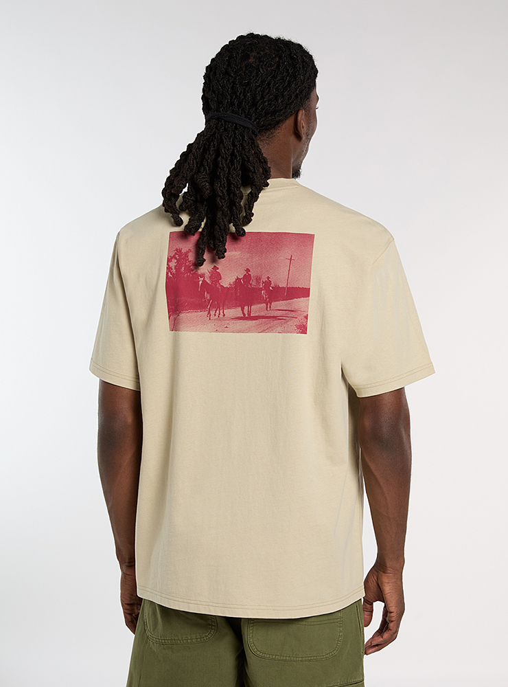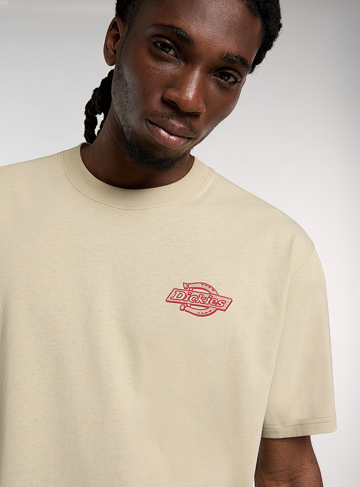 Beige Dickies t-shirt med liten logga på bröstet och stort tryck (med hästar!) på ryggen.