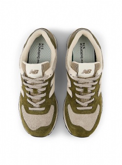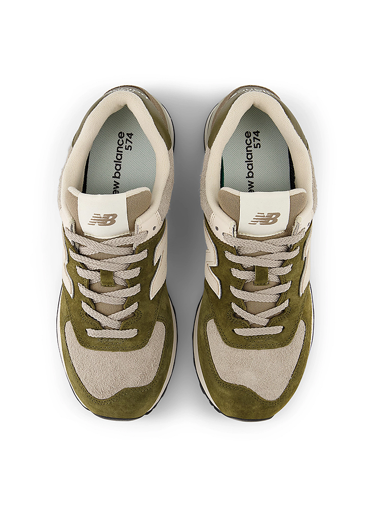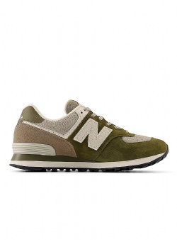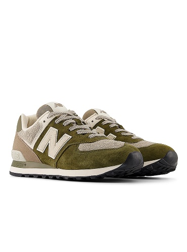 Mörkgrön och grå New Balance 574 i lite mer rejäla materialval som läder och mocka med olika struktur.
