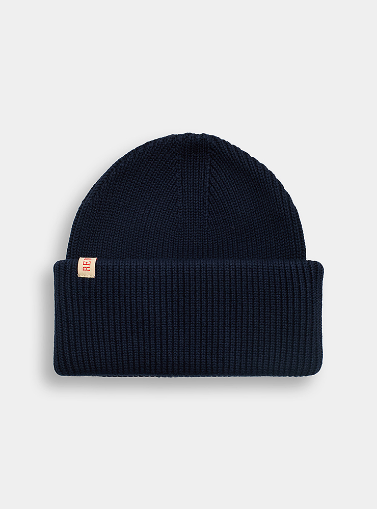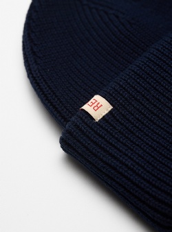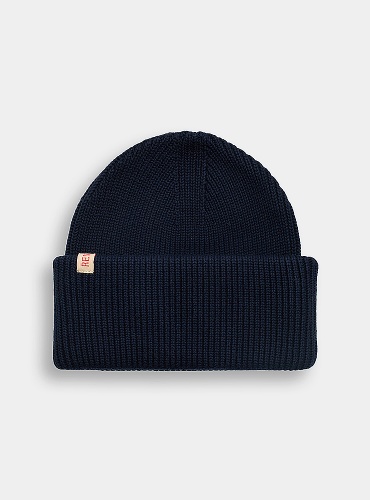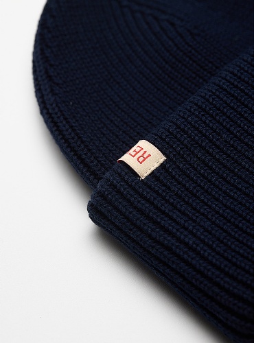 Stickad mörkblå Revolution mössa med liten logopatch på sidan. 100% ekologisk bomull.