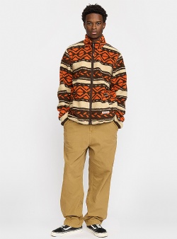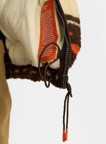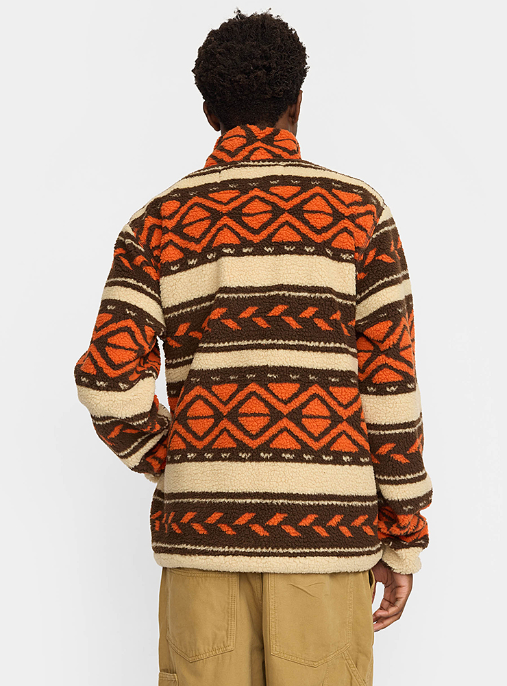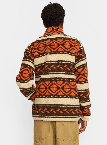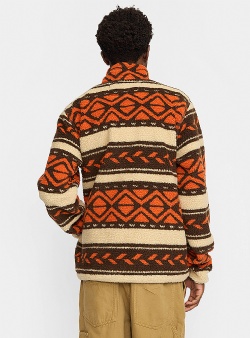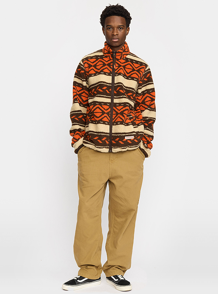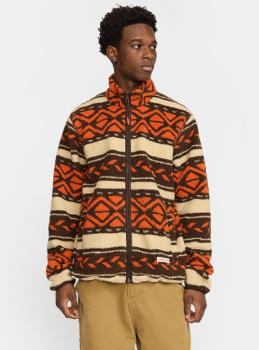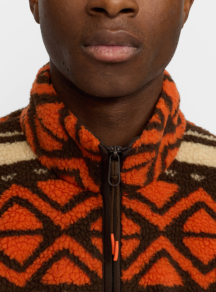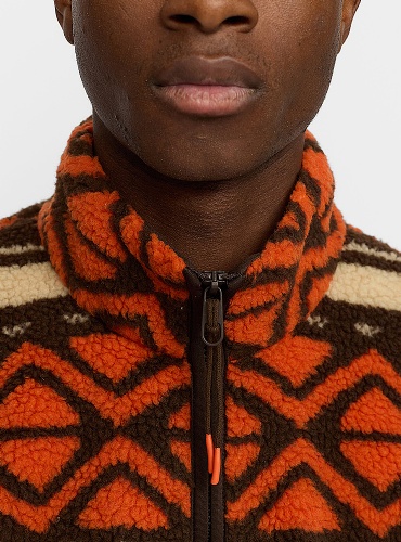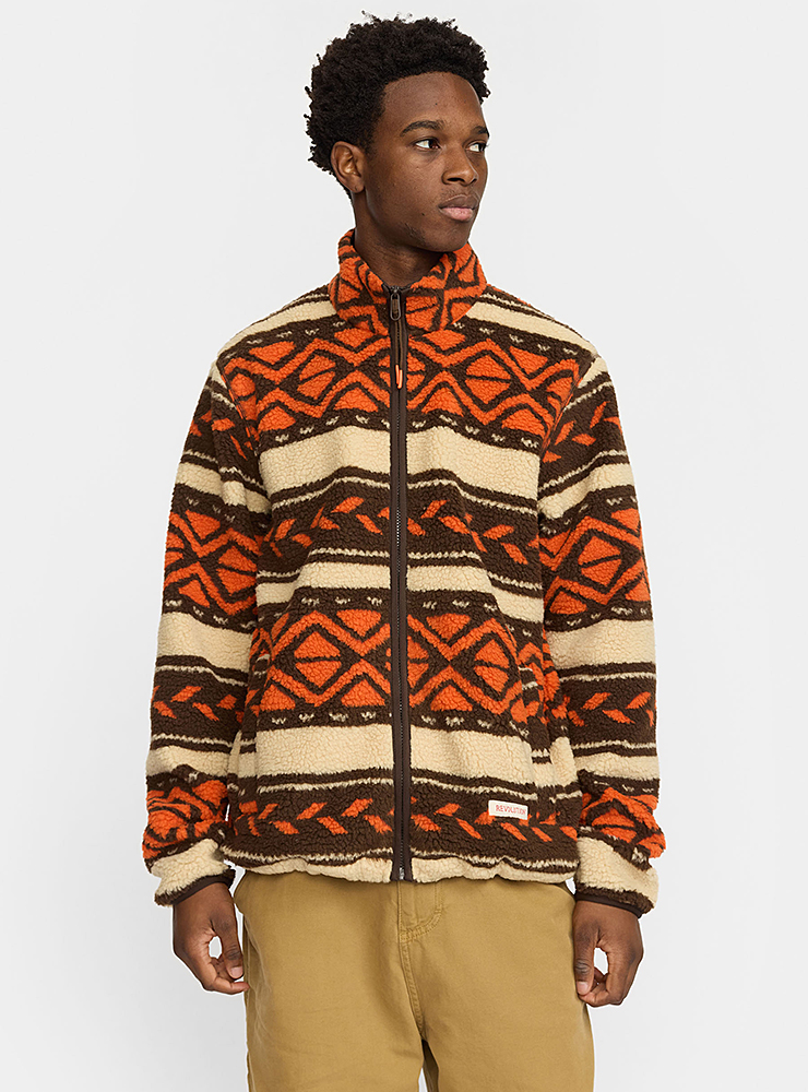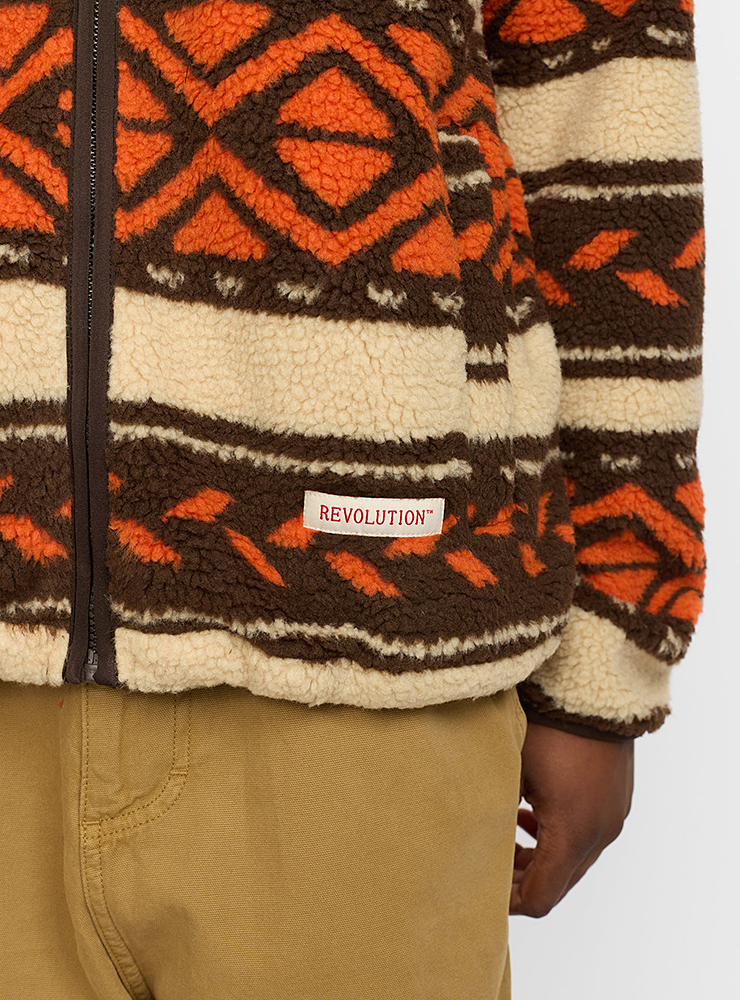 Varm Revolution sherpa jacka, i orange och brunt mönster. Med hög krage, gosiga fickor, resår i midjan och dragkedja är den perfekt för kalla kvällar.