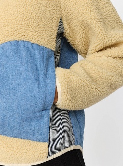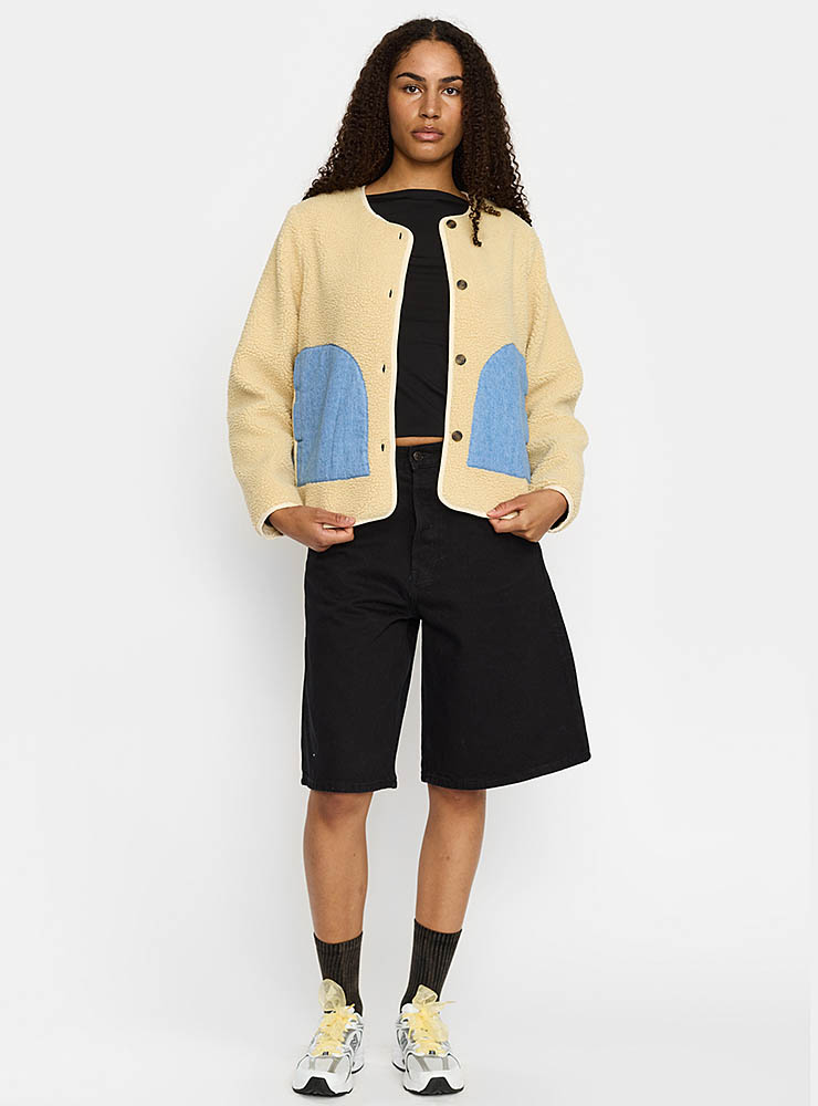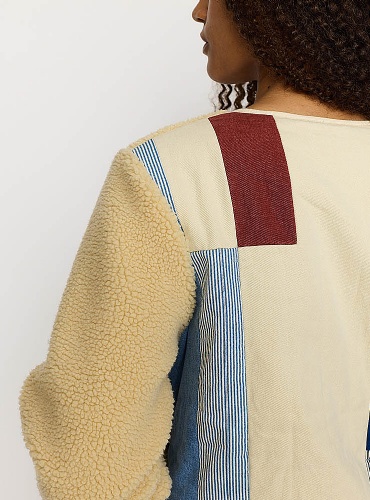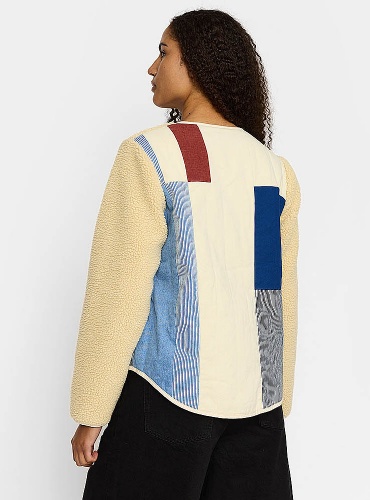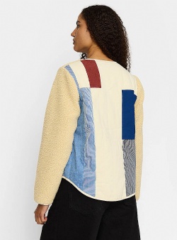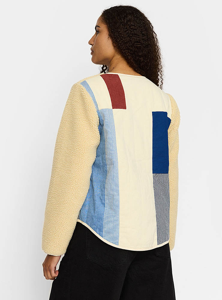Teddy fleece jacka från danska Selfhood. Off white med kontrasterande fickor i ljus denim fram och hela ryggen i patchwork med olikfärgade tygstycken. Rundat avslut med ljus kant. Lätt fodrad. Huvudsakligt material återvunnen polyester.