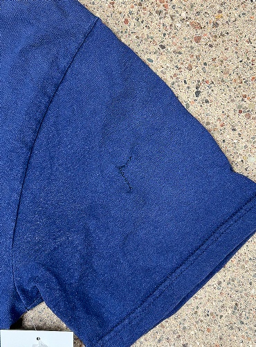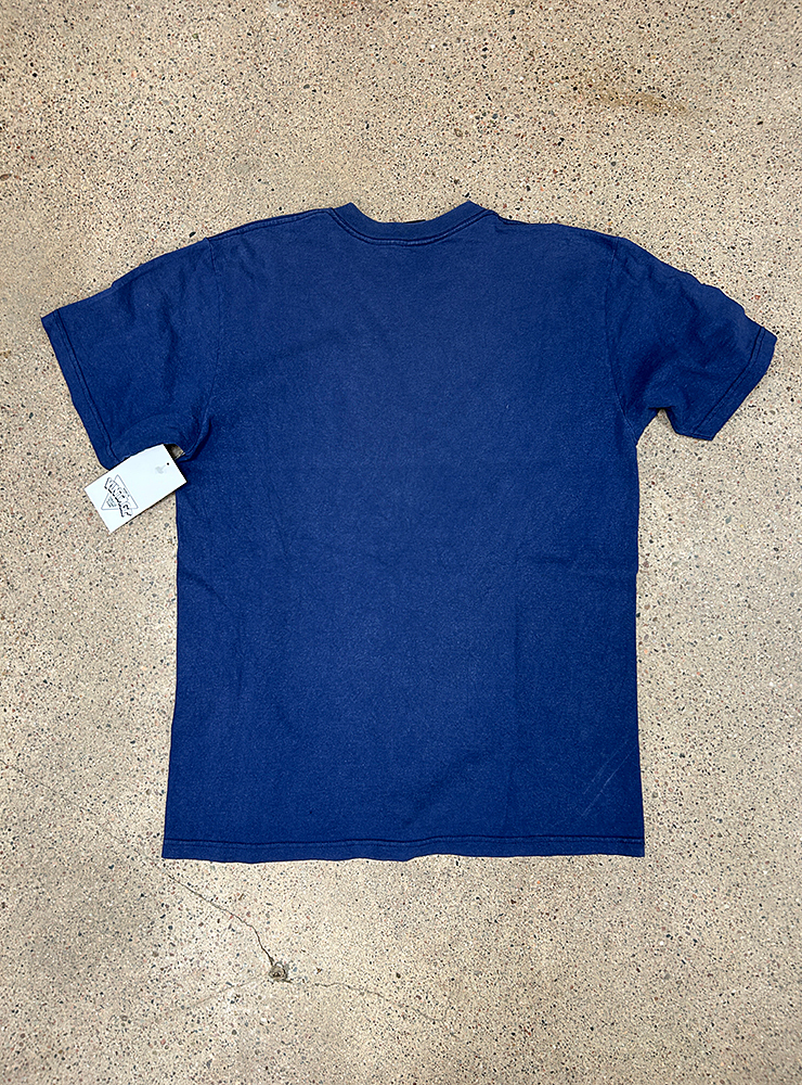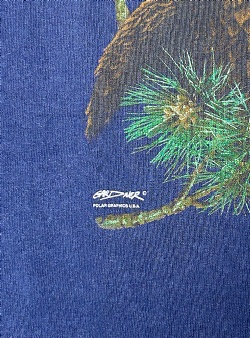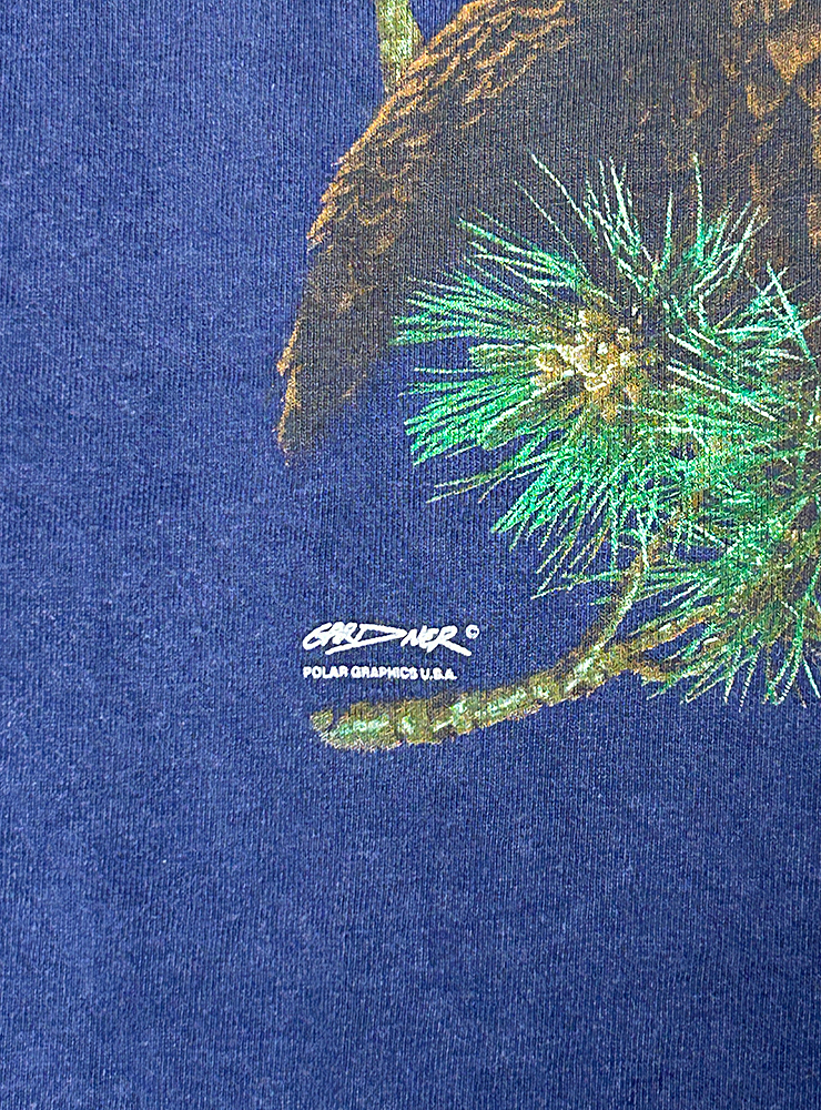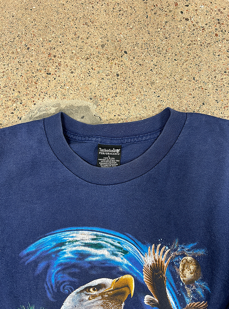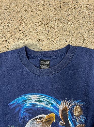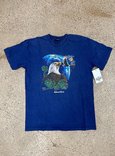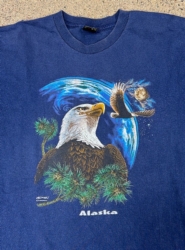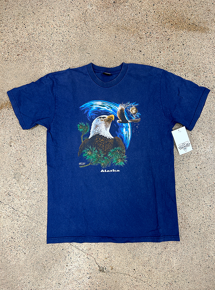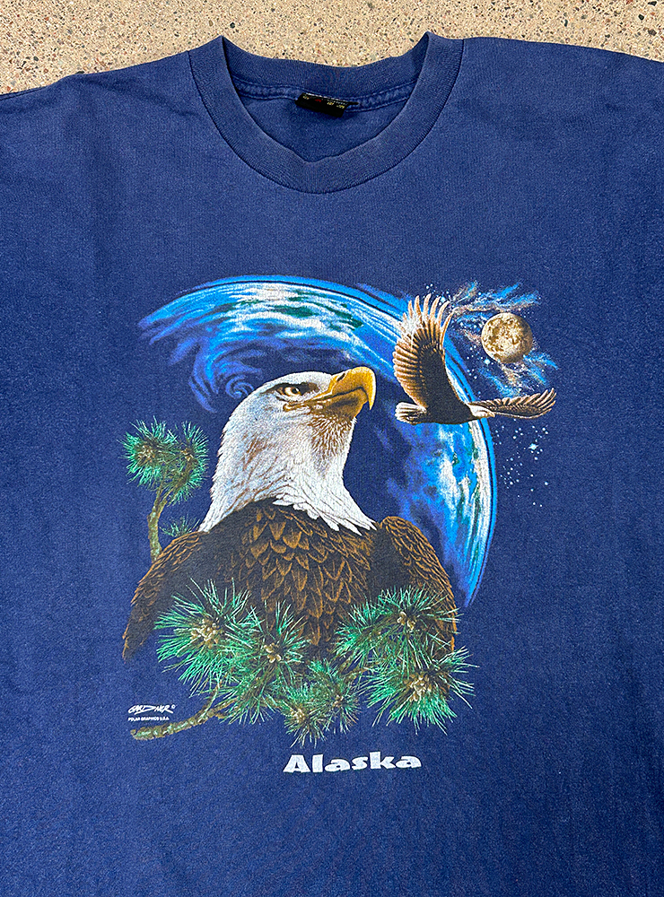 Alaska eagle tee. Marinblå t-shirt med mäktigt tryck med örn, jordglob, barrträd och Alaska. Matig bomull och i mitt tycke väldigt fin, lätt blekning i färgen. Lagning på ena ärmen.