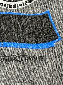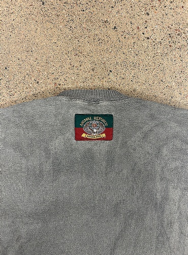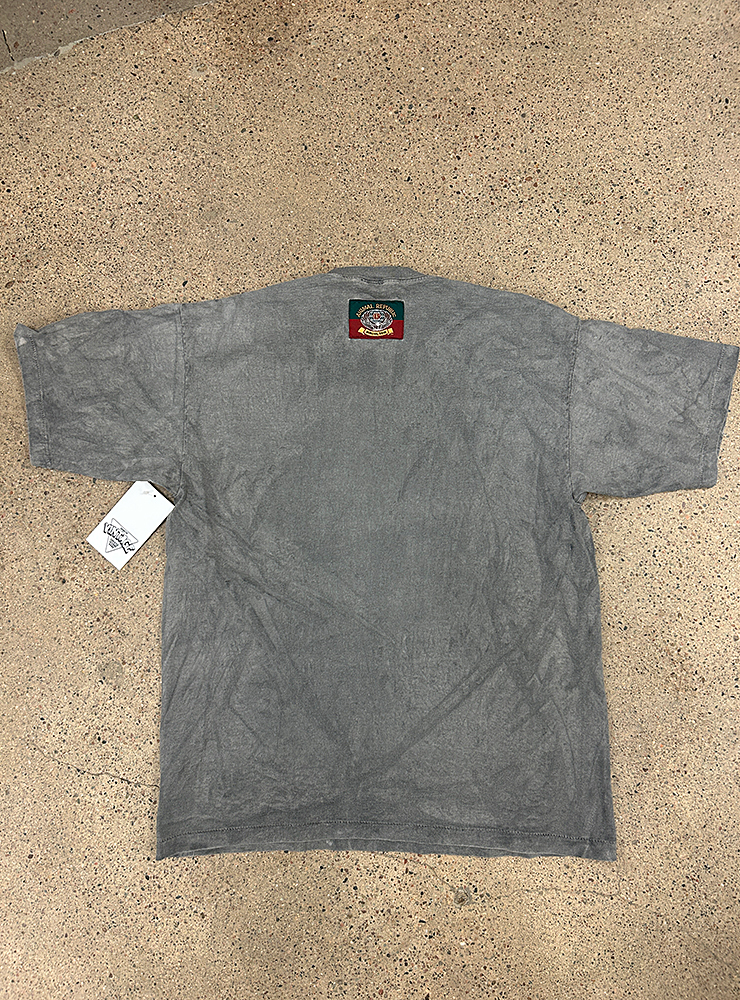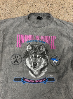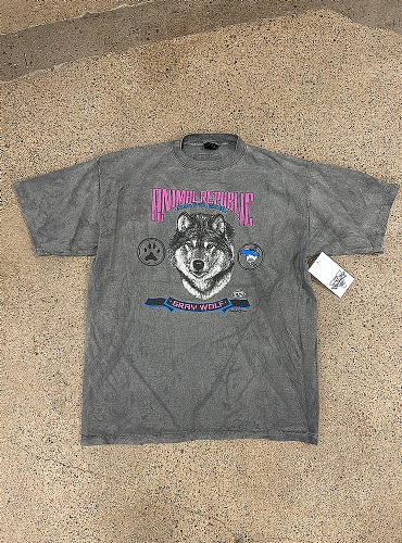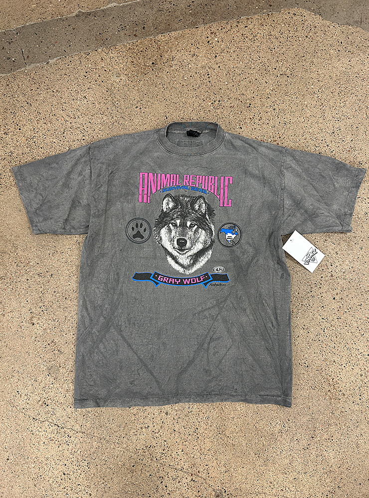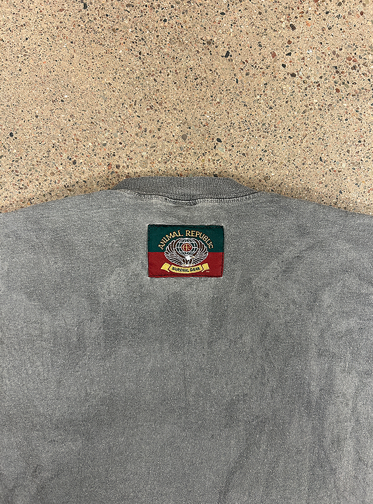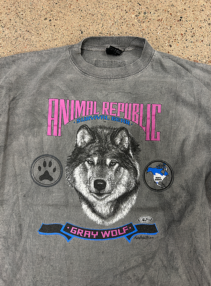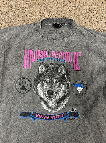 Animal Republic tee. Grå nedtvättad t-shirt med vargprint och text i riktig 90-tals färgställning med blått, svart och rosa swellprint. Animal Republic, Survival Gear, Gray Wolf. Påsydd logga på baksidan.