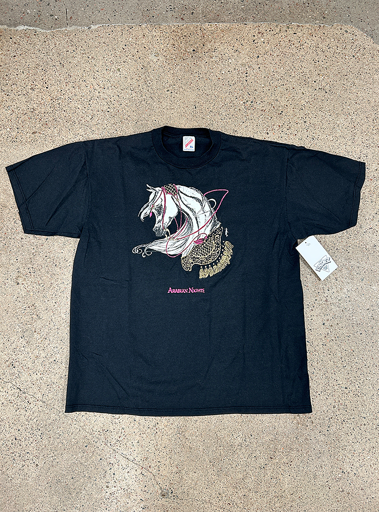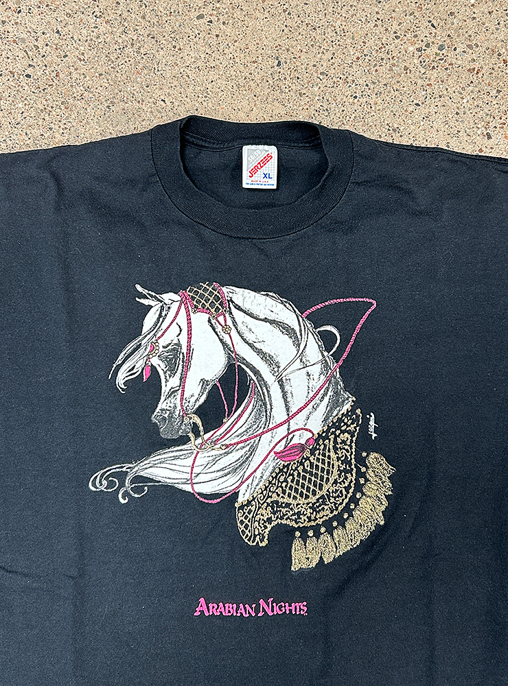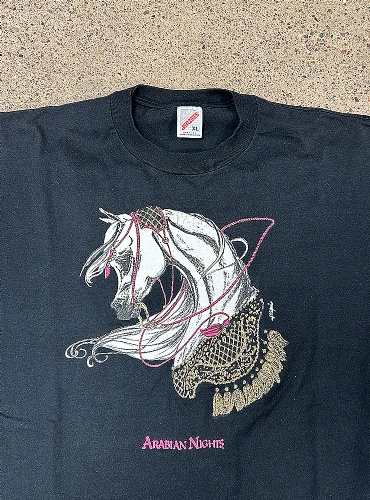 Arabian Nights tee. Svart t-shirt med tjusigt hästprint i vitt, rosa och guld. Grymt skick.