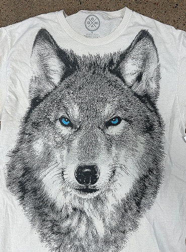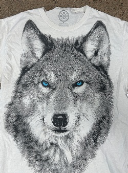 Blue eyed wolf tee. Ljus t-shirt med stor varg med drömmiga blå ögon.