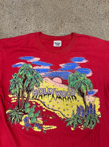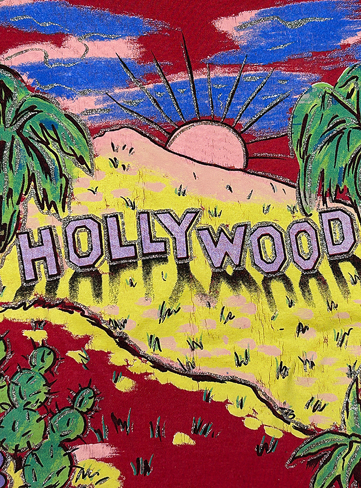 Hollywood tee. Fantastisk röd t-shirt med Hollywood skylten, sol, palmer, glitter och kaktusar. Chefs kiss! Boxig passform, små hål på ena ärmen och axeln.