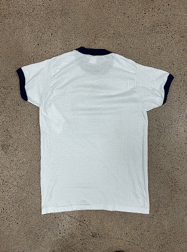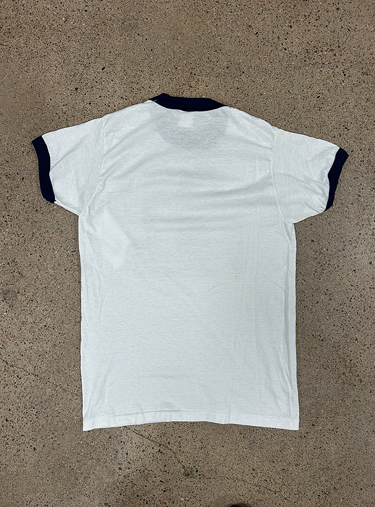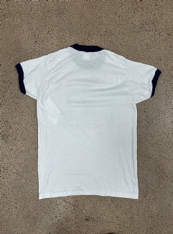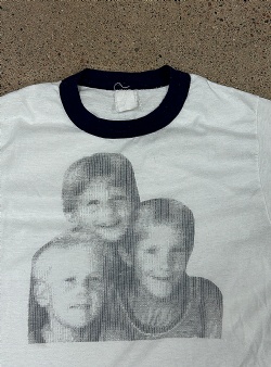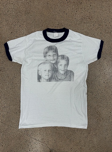 Vit ringer t-shirt med marinblå muddar. Tryck med tre barn som gissningsvis är syskon. Trycket ser ut att vara gjort med nån gammal matrisprinter typ. Väldigt speciellt. En sån där t-shirt som man skulle vilja höra storyn bakom.
