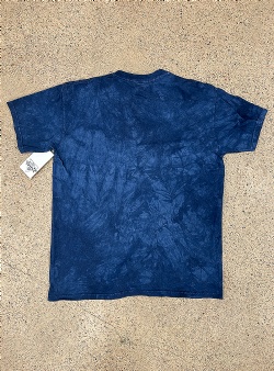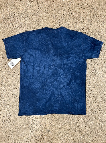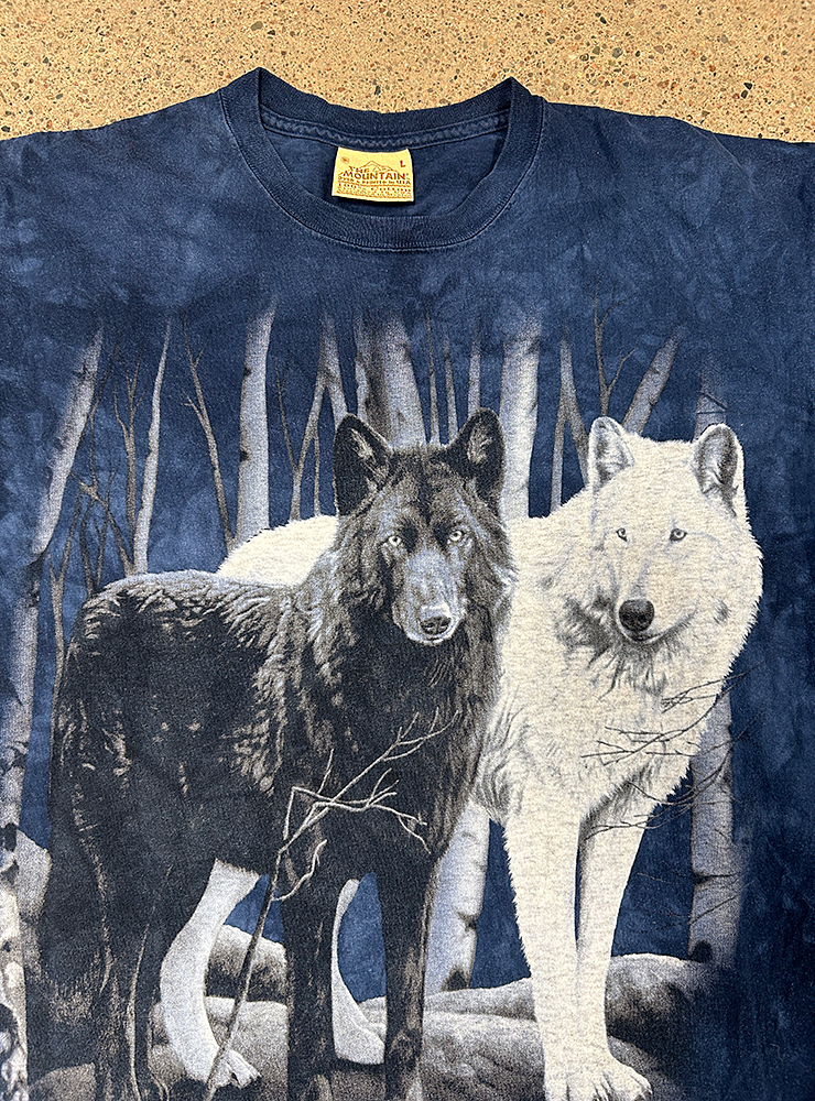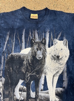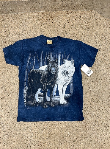 Wolf couple tee. Blå tie dye mönstrad t-shirt med stort maffigt vargprint. Två vargar, en vit och en svart i skogslandskap.