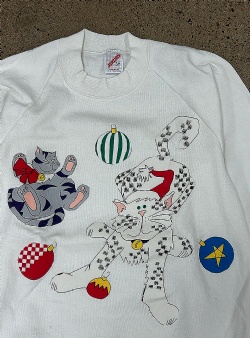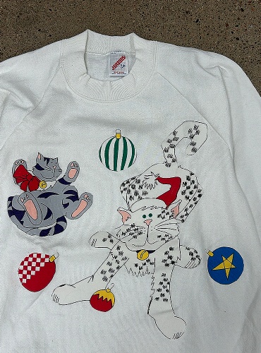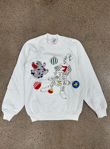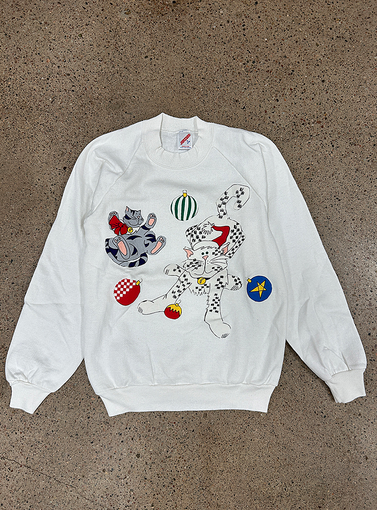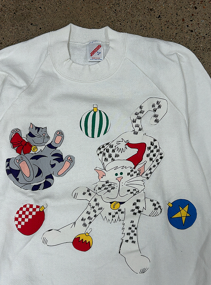 Christmas Cats crew. Vit pytteliten sweatshirt med pålimmade katter och julgranskulor. Hemmapysslad gissningsvis. Gravt charmig. Från Jerzees i storlek dam S (se mått nedan).