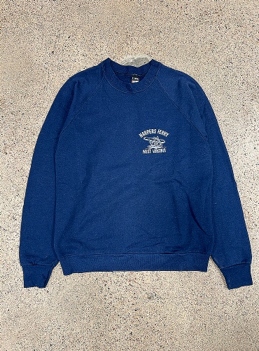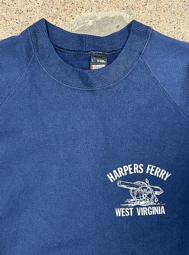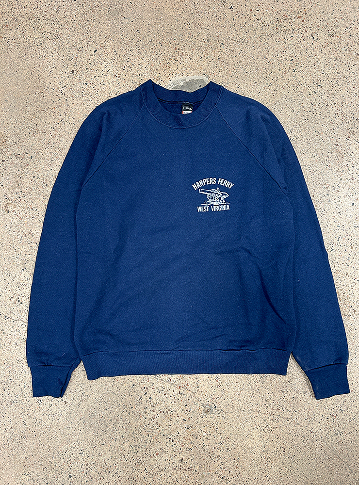 Harpers Ferry crew. Marinblå sweatshirt med kanonprint och texten Harpers Ferry West Virginia. Mycket fin retromodell med raglanärmar. Från Screen Stars i storlek L (se mått nedan).