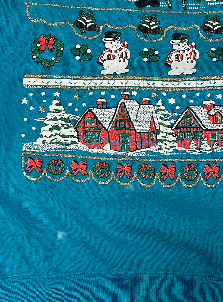 Sparkling christmas crew. Turkos sweatshirt med klockrent retro julmotiv med glitterprint. Små missfärgningar fram och små fläckar på ena ärmen.