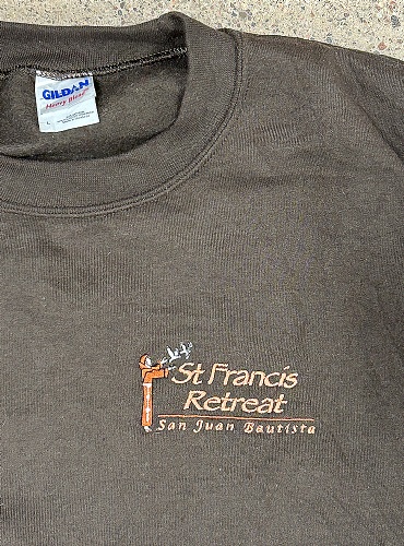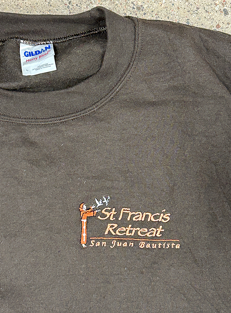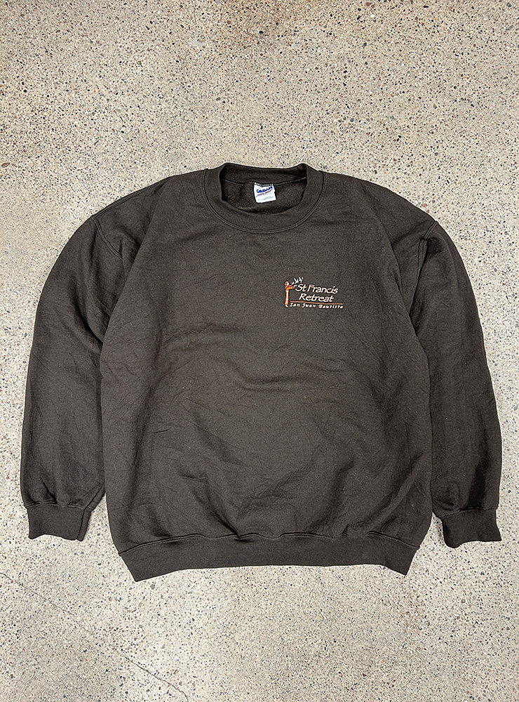 Brun kraftig vintage sweatshirt från vår second hand avdelning. Broderad logga från St Francis Retreat, San Juan Bautista. Munk, duvor och allmänt bra stämning.
