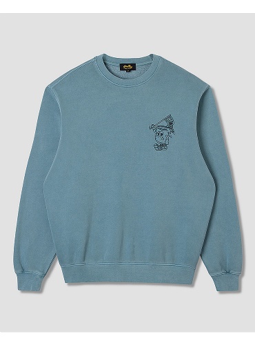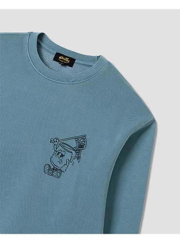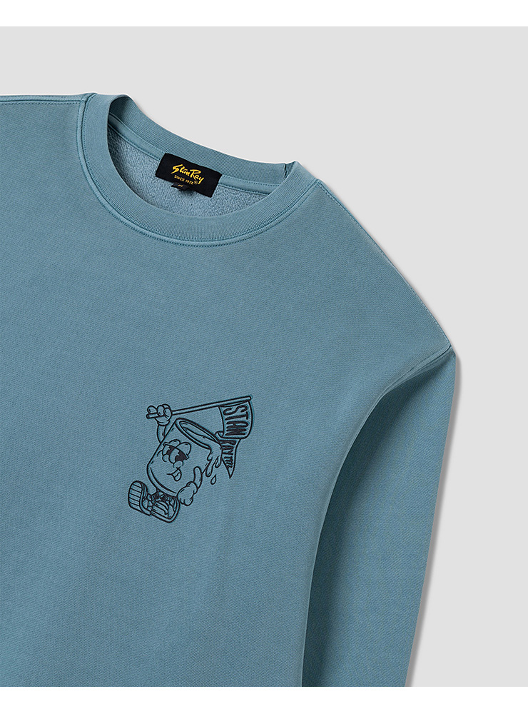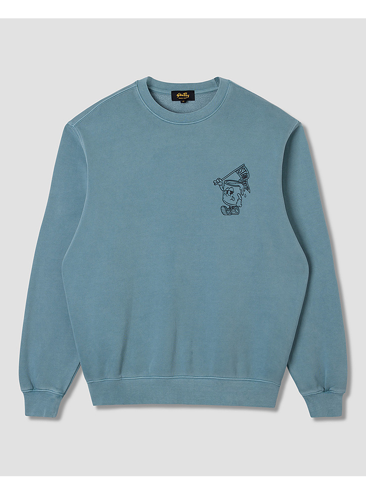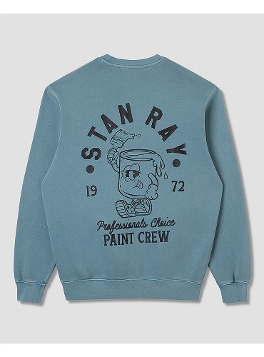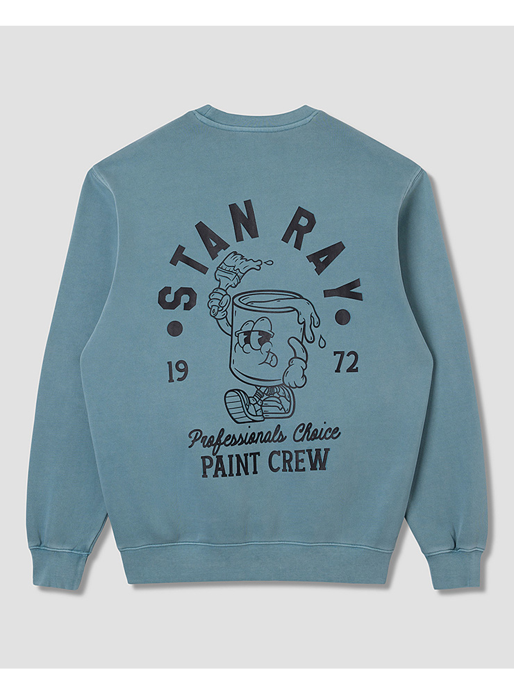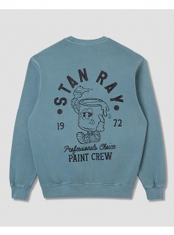 Tjock, nedtvättat grönblå sweattshirt med rymlig passform. Liten logo på bröstet och stort ryggtryck. Stan Ray Professional Choice Paint Crew 1972.