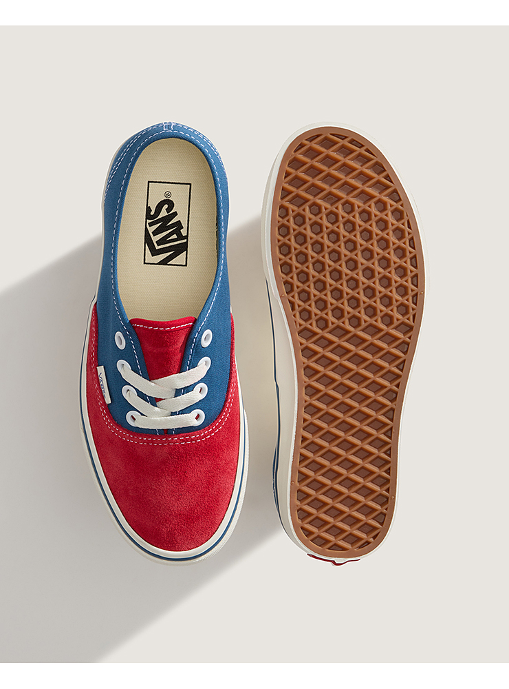 Vans Authentic twotone. Blå tygsko med tå och plös i röd mocka. Snörning och vulkaniserad wafflegripsula. Vans originalmodell från 1966 i en kanonfin färgställning.